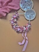 Découvrez cette charmante petite couronne de fleurs séchées mêlant les couleurs rose, blanche et prune. Un joli ruban tombant de couleur vieux rose vient sublimer l’ensemble.