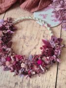 Craquez pour cette petite couronne murale ornée sur sa moitié de macramé torsadé et sur son autre moitié de fleurs séchées et stabilisées dans les tons rose, parme et prune.
