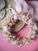 Une couronne tout en douceur mêlant entre autre les fleurs séchées et stabilisées suivante : dahlias, broom bloom, lin, pampa, lagurus, phalaris, avoine, hortensia et nigelles orientales…