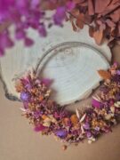 Suspendue à un mur ou à une porte, cette petite couronne ornée de fleurs séchées et stabilisées avec ses tons vibrants et colorés mariant le orange, violet et fuchsia apportera de la gaité dans votre intérieur.