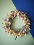 Cette petite couronne murale de fleurs séchées “Printania” a été imaginée autour des couleurs bleu, jaune, vert et écru et met particulièrement à l’honneur la luminosité des immortelles.