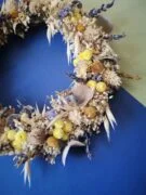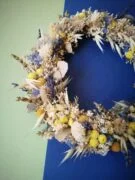 Cette couronne fleurie est constituée notamment des fleurs séchées et stabilisées suivantes : broom bloom, brins de lavandes, avoine, immortelles, phalaris, gypsophile, statice, limonium,eucalyptus…